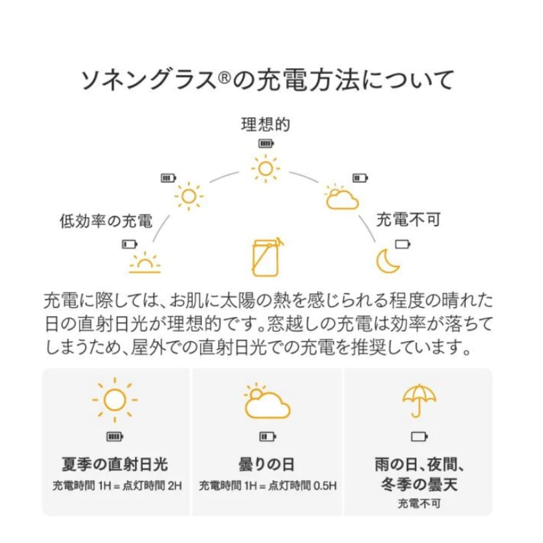 日中の太陽光で蓄電し、暗くなったら優しく灯る